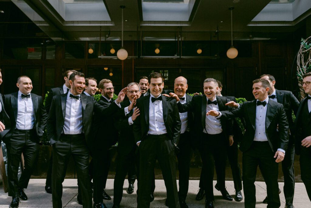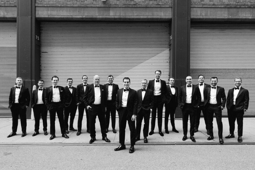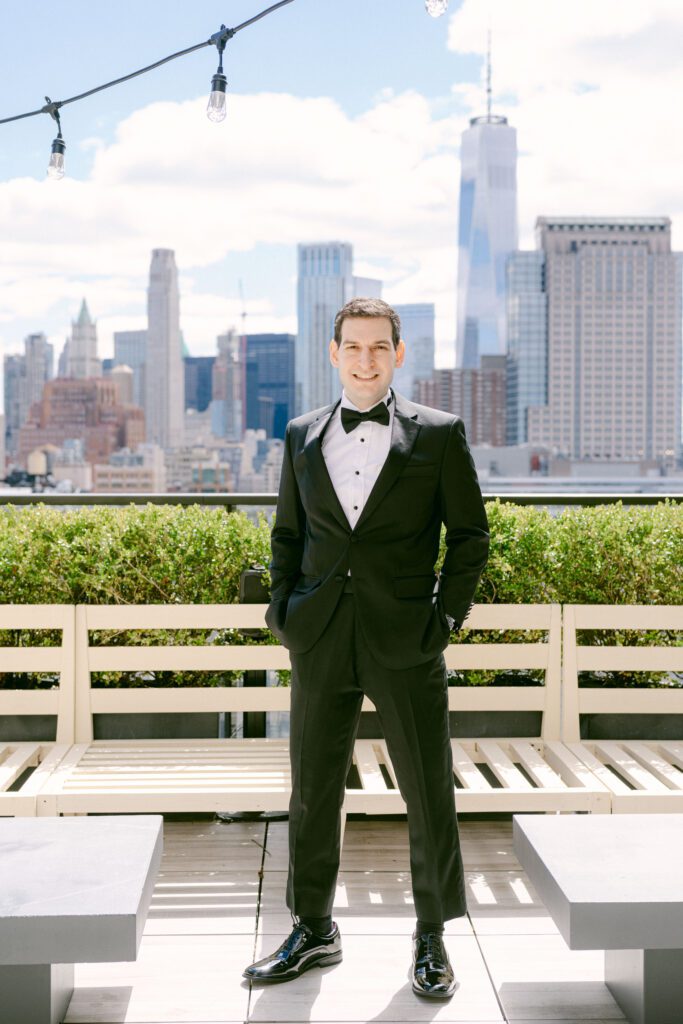 Meanwhile, Andrew enjoyed epic rooftop views as he prepared for the day. With the New York City skyline stretching behind him, his groom portraits felt cinematic and bold — the perfect contrast to the elegance inside.
