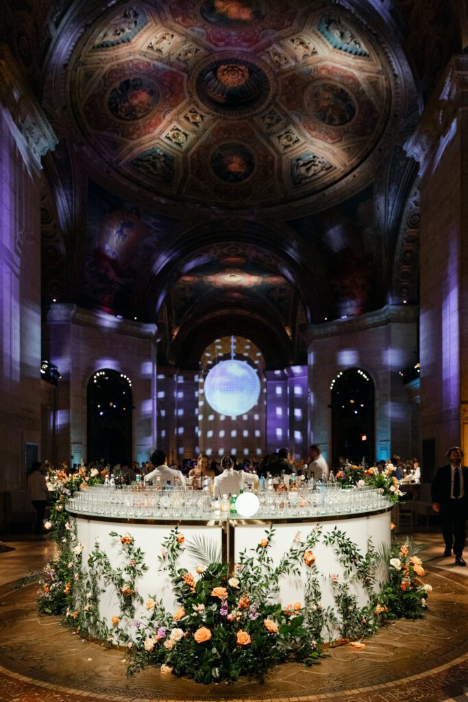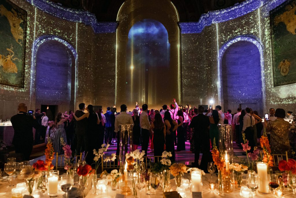 Custom lighting by Cipriani Events transformed the space as the evening unfolded, highlighting the architectural details while creating a vibrant party atmosphere.